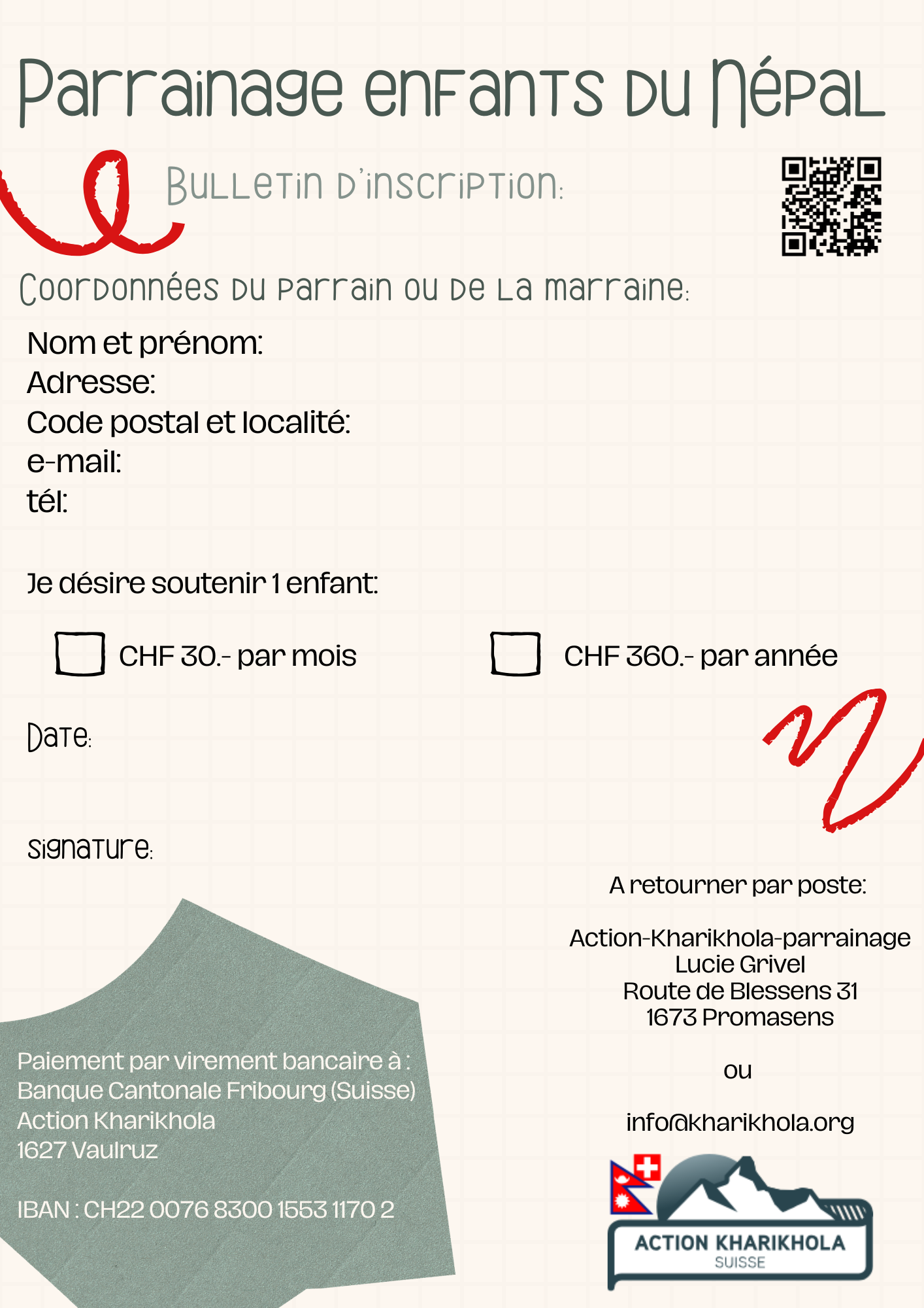 L'association s'occupe de parrainer les enfants qui fréquentent l'école de Kharikhola. Ce soutien (CHF 360.-) leur permet de suivre une instruction régulière, d'être nourri et vêtu correctement. Le comité a récemment élaboré une "charte de parrainage" que chaque parrain a reçu et qui résume les conditions pour le soutien d'un enfant.
